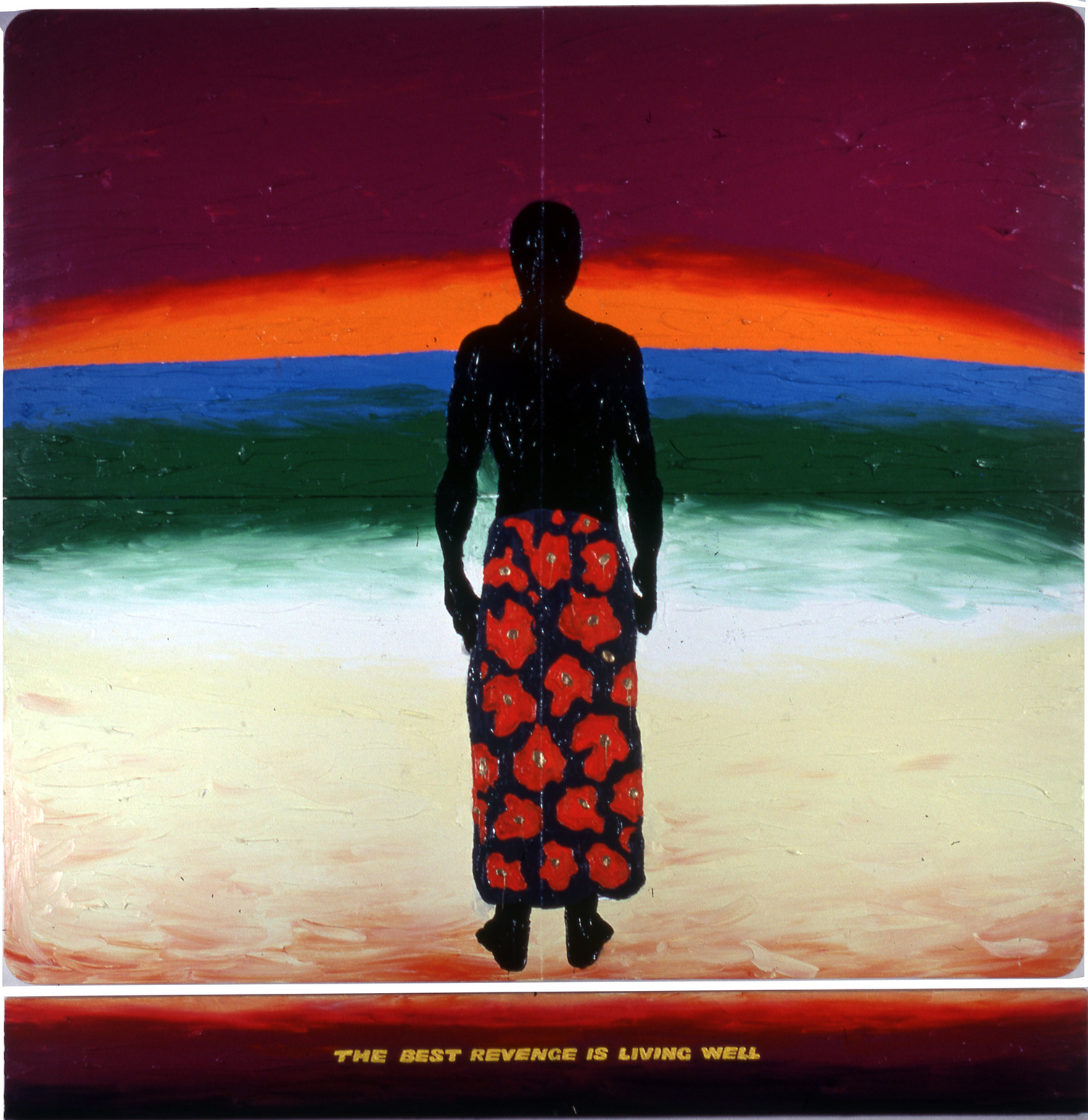 Compounded, then with the text below, we are presented with a silhouetted, thereby anonymous and universal, image of human sacrifice. This subtly plays into our Western sensibilities of a generic Christianity co-existing with a cynical, if thoroughly co-dependent, belief in aggressive medical procedures. It is a representation rife with the dialectical semiotics of physicality and mysticism associated with both Western medicine and Christianity, including an inherent distrust in their motivations and efficacy. The biting visual and rhetorical criticality and violence of this painting is echoed elsewhere throughout the series, specifically in Killer Rabbit, Kill Me, Sabain Zoga, No Abuse of Power Leads to Wisdom and several others.