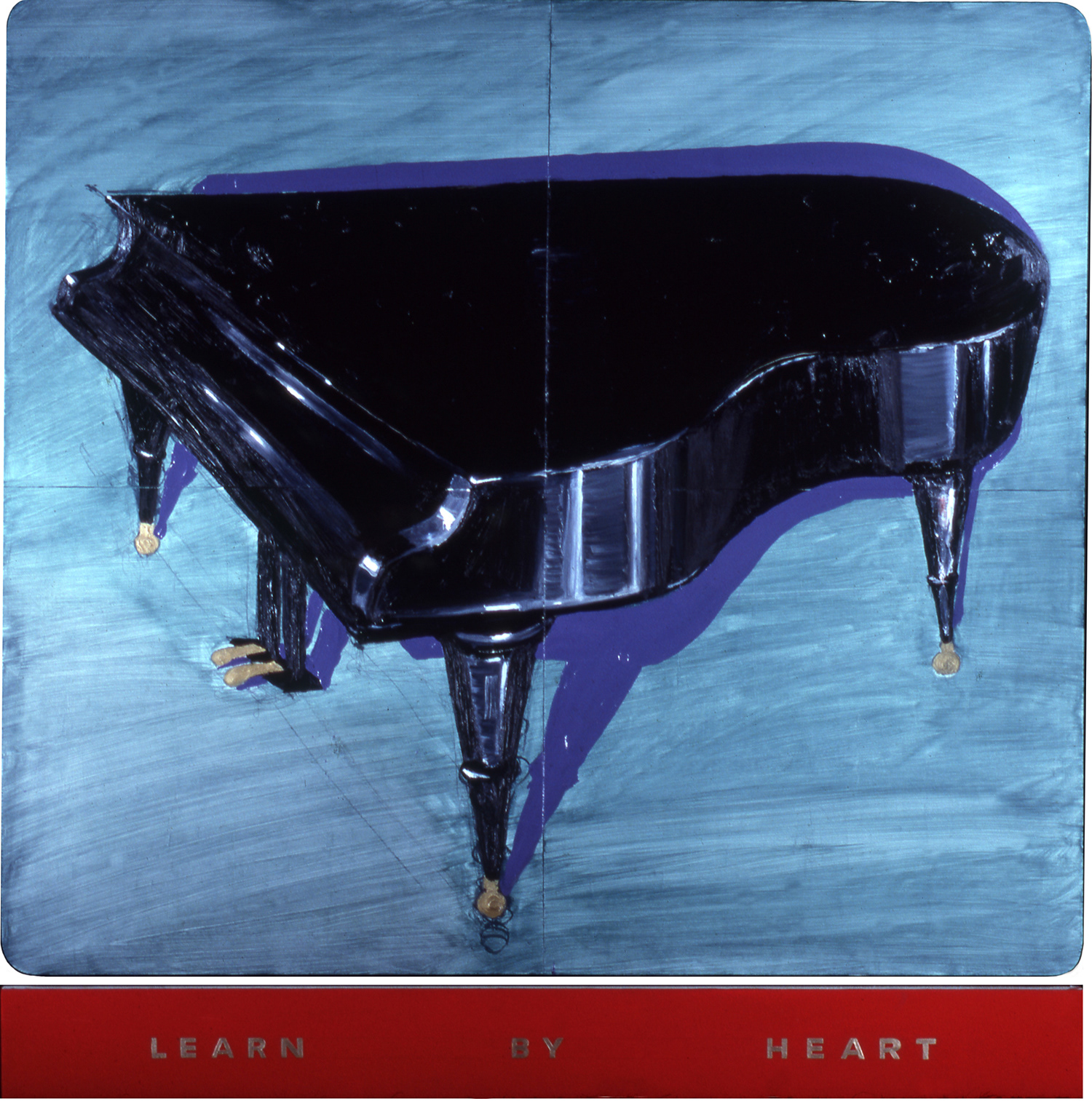 However, we read this and other pieces, it is always necessary to remember that Lamprecht is forcing the viewer to transcribe everything he presents us with, even if his purpose is that meaningful interpretation may itself be entirely elusive. Nothing is superfluous and every aspect of every piece functions as information. This is true of the physical makeup of the work, vis a vis the choice of materials (wood, steel, leather, gold leaf, formica, etc.) as well as the semiotics of each’s text and image. We can even read into the very title of the project a series of riddles: about art and painting, about the grandiosity of civilization, about Lamprecht’s international distance on any particular perspective and, by contrast, about the simple individual chimeras of mundane human longing.
