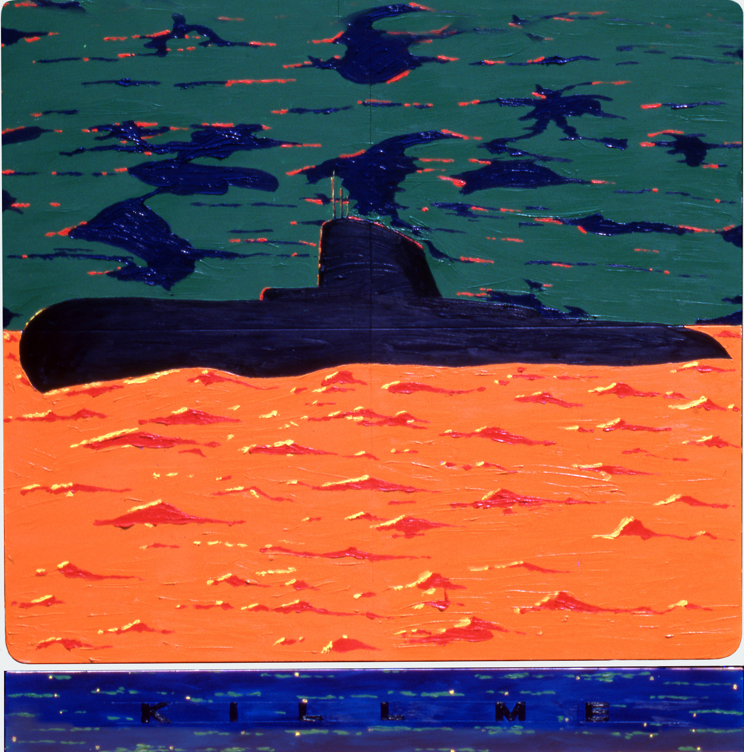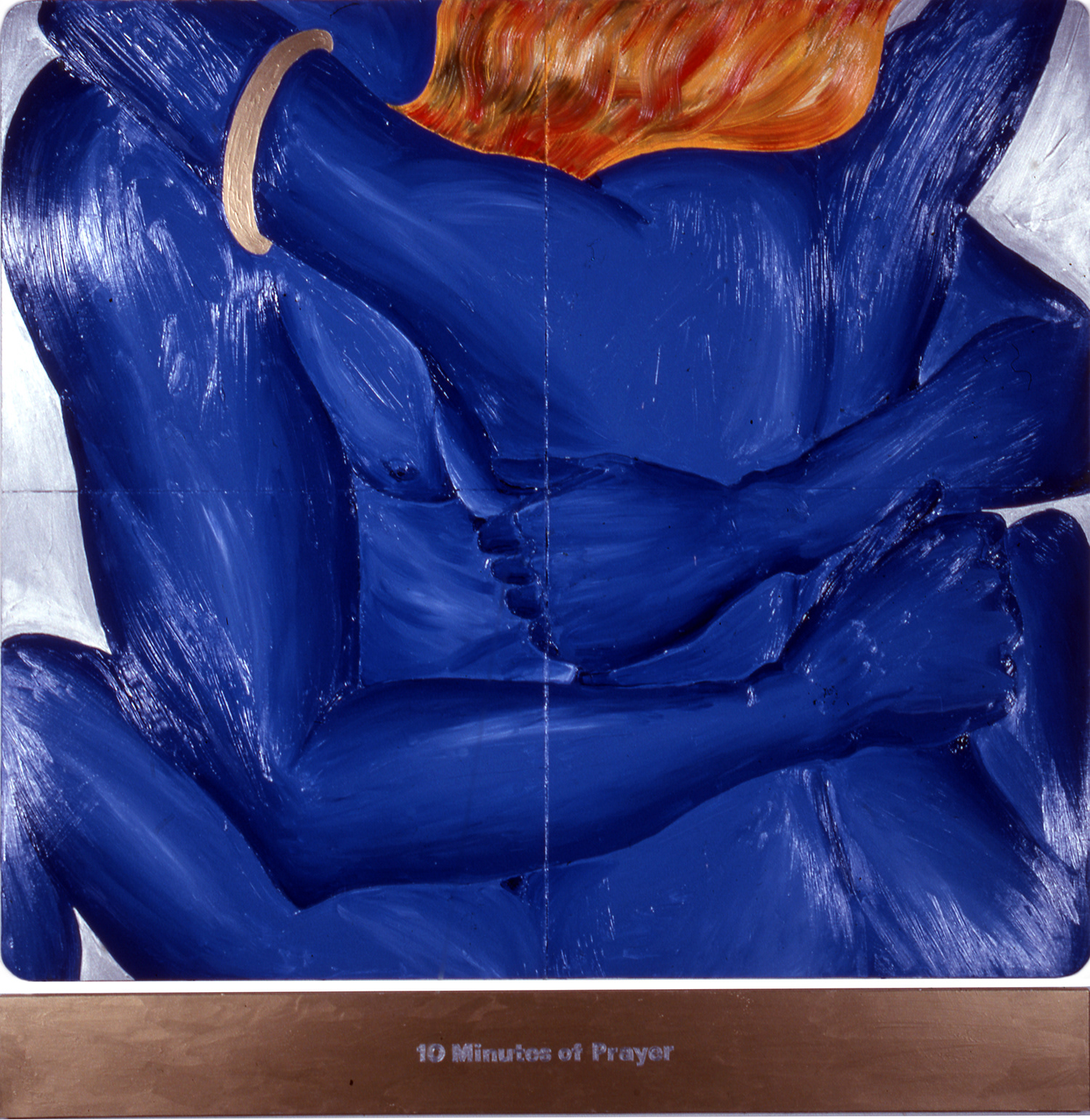 Some paintings, however, offer simple, iconic images, which along with each caption/text create a semiotic complexity that is completely open-ended in their possible interpretations. For example, Welcome Back, another painting from the early part of the series, presents a greatly enlarged human fetus in an upright posture, as if seated in a lotus position. This piece is rare in the series in that its basic structure deviates slightly from the norm; the squarish center panel is flanked on left and right sides by a text panel, and the words Welcome (left) and Back (right) read vertically top to bottom, as in Asian calligraphic writing. The painting is rendered with a blue-black field throughout image and text, with the text and contour line of the image painted in a pinkish red hue. The handling of the fetus image, in a simple, schematized outline, lends it a transparent, celestial quality, further emphasized by its extreme scale. This huge, glowing nocturnal image with its movie-placard-like text suggests, at first, some science-fiction film, and the exaggerated proportions of the fetus’ head to its body reinforces this reading, especially given that the bizarre image of a fetus is so prominently influential to sci-fi imagery in general. Once one gets past this initial reading, however, a number of other possible sources for this image begin to make themselves felt.