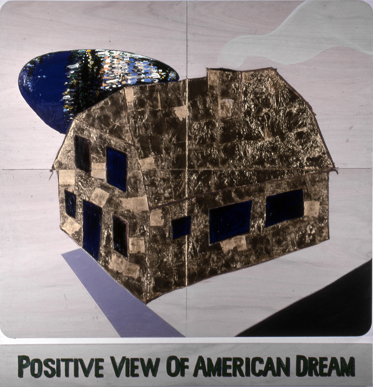 The series of paintings reproduced in this book, collectively entitled Projections of Dream of Monuments, were executed in New York by Tomek Lamprecht, an artist of Polish and German birth, who spent much of his early life in Poland, Scotland and Cyprus and parts of his adult life in Bali and Southeast Asia. Painted during the period 1986-1991, these works not only are the product of Lamprecht’s uniquely international and relativistic viewpoint but also reveal the influence of their immediate context of international events, such as the war in the Persian Gulf and the Tianenman Square uprising in China. Throughout the work, one has a sensation of distanced media intervention, as though what is presented has been reported and edited, a distillation through the hands of many intermediaries. The paintings also reveal Lamprecht filtering the flavor of such news through the waning days of Reaganism, exposing a particularly American view of double-standards and contradictions, not to mention our electronically-filtered, vicariously experienced perceptions of the world. It is not surprising that the work’s political undercurrents and esthetic/conceptual basis are combined and fused into a viewpoint that can be seen as textbook-definition Post-Modernism: a circuitous mixture of highly-charged appropriated imagery, irrespective of period, place or meaning (context), in certain cases skewing meaning that might otherwise exist within a particular image or phrase. Further captioned with text commentary, itself drawn from a variety of sources and contexts, the paintings are manipulated in such a way as to confuse the meanings of both image and text. Often, these composite pieces provoke ironic readings, usually exaggerating the image’s absurdity or clichés of the text. In each of the pictures/signs, a belief is being deconstructed, torn apart, rather, with physical, pictorial and rhetorical violence.