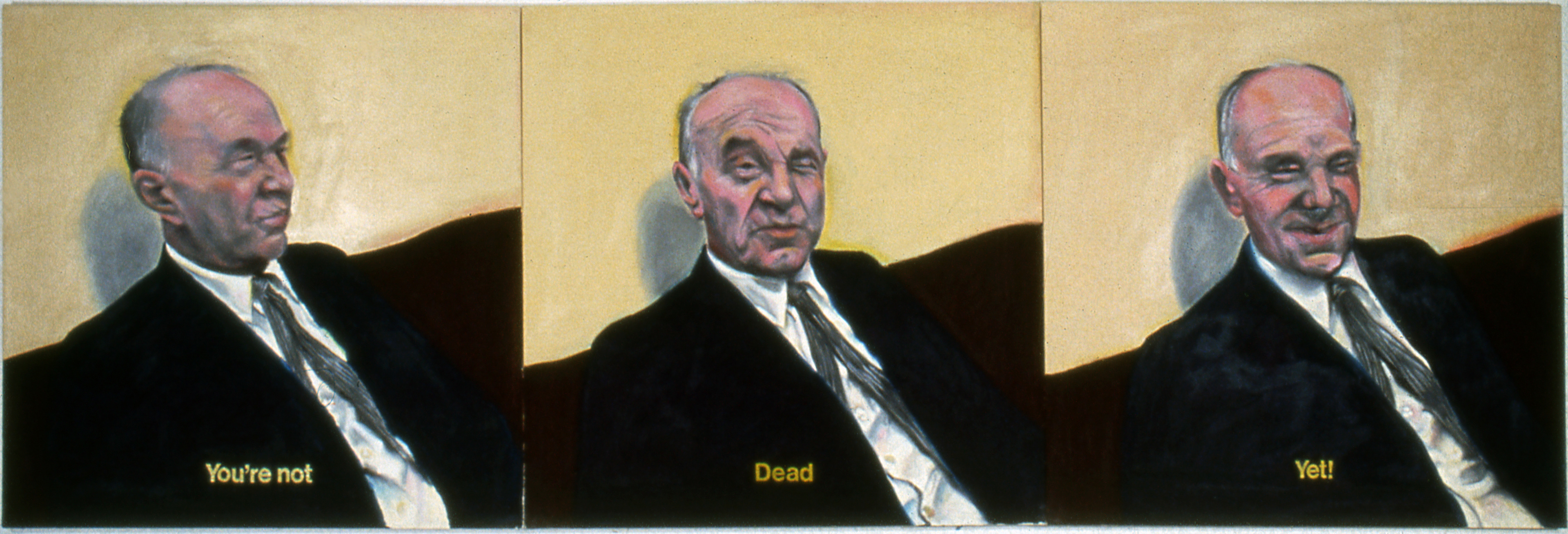 You're not Dead Yet! — Oil stick on canvas and transfer type, 120" x 40", 1984